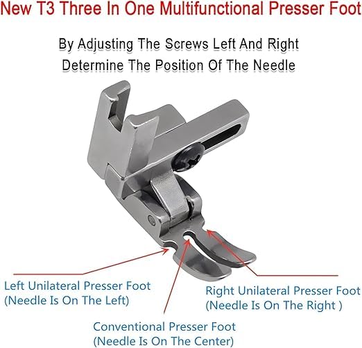 T3 Zipper Presser Foot This Is a New 3-In-1 Presser Foot for Single-Needle Industrial Lockstitch Sewing Machines. It Can Be Used as a Zipper Presser Foot, a Rope Presser Foot, or a Normal Presser Foot It Is Able to Adjust the Position of the Needle for Left, Center, or Right-Sided Sewing. Suitable for a Wide Range of Sewing Projects, from Fabrics of Different Thicknesses to Delicate and Intricate Designs. Provides a Smooth, Even Feed for Precise, Professional-Looking Sewing Results Every Time